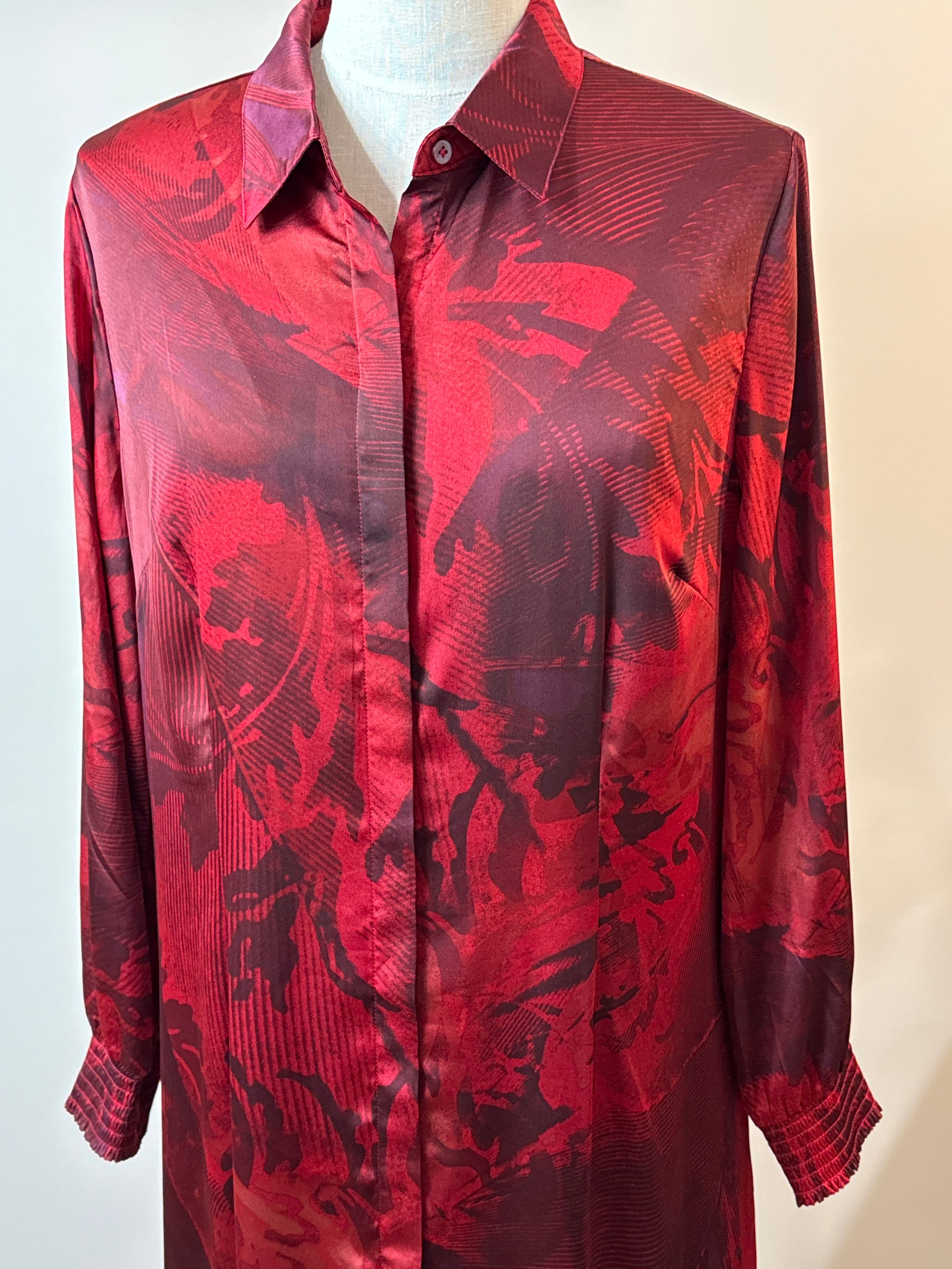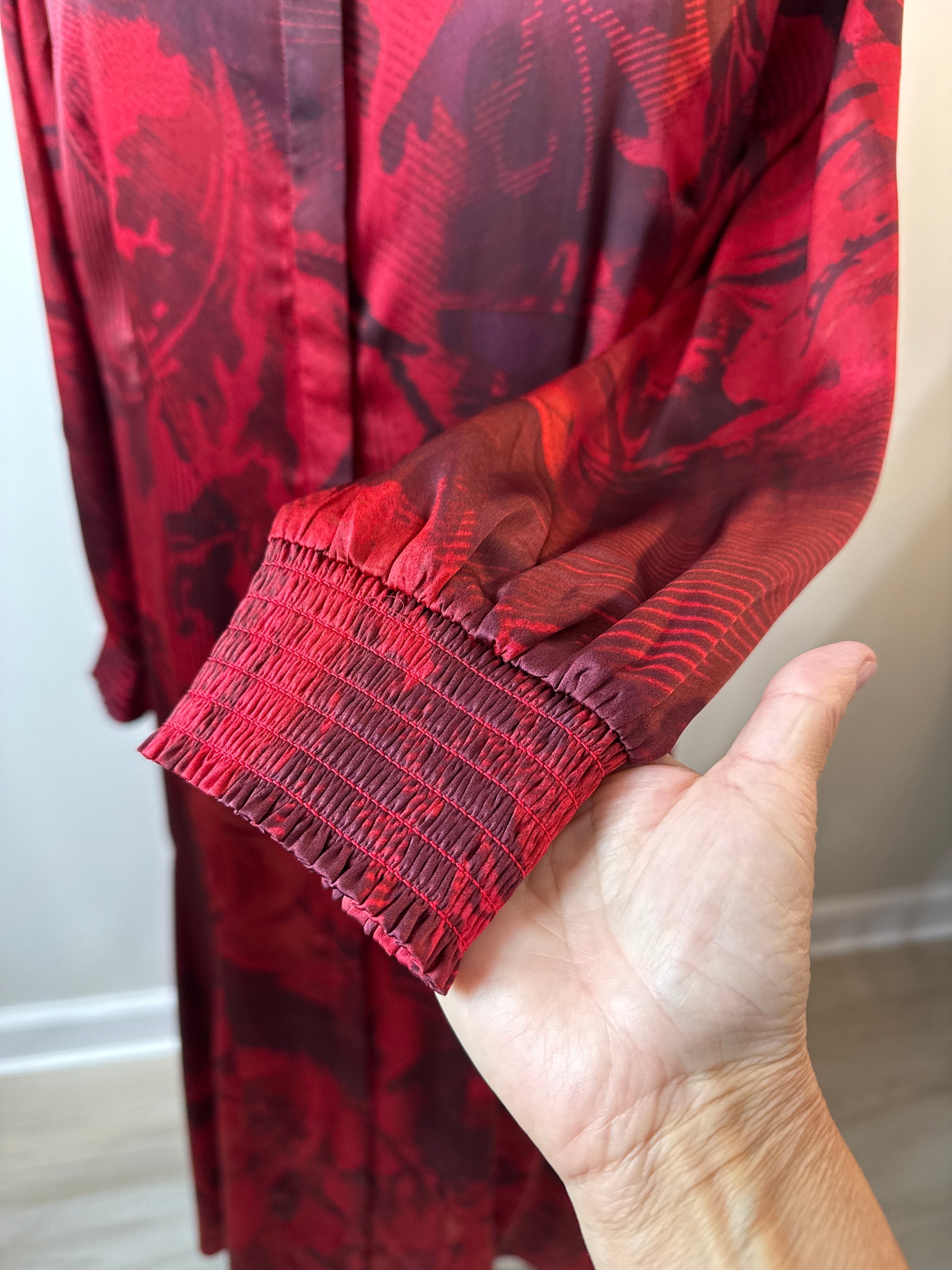 Size 2 NWT $149 Shirt Dress Fancy Love in Wild Poppy and Black. Gorgeous dress for the holidays or special event. Hidden buttons all the way up the front, elastic at wrists for an elegant touch. P2P 22” and overall length 53” approx. pleats at bottom adds another touch of class.