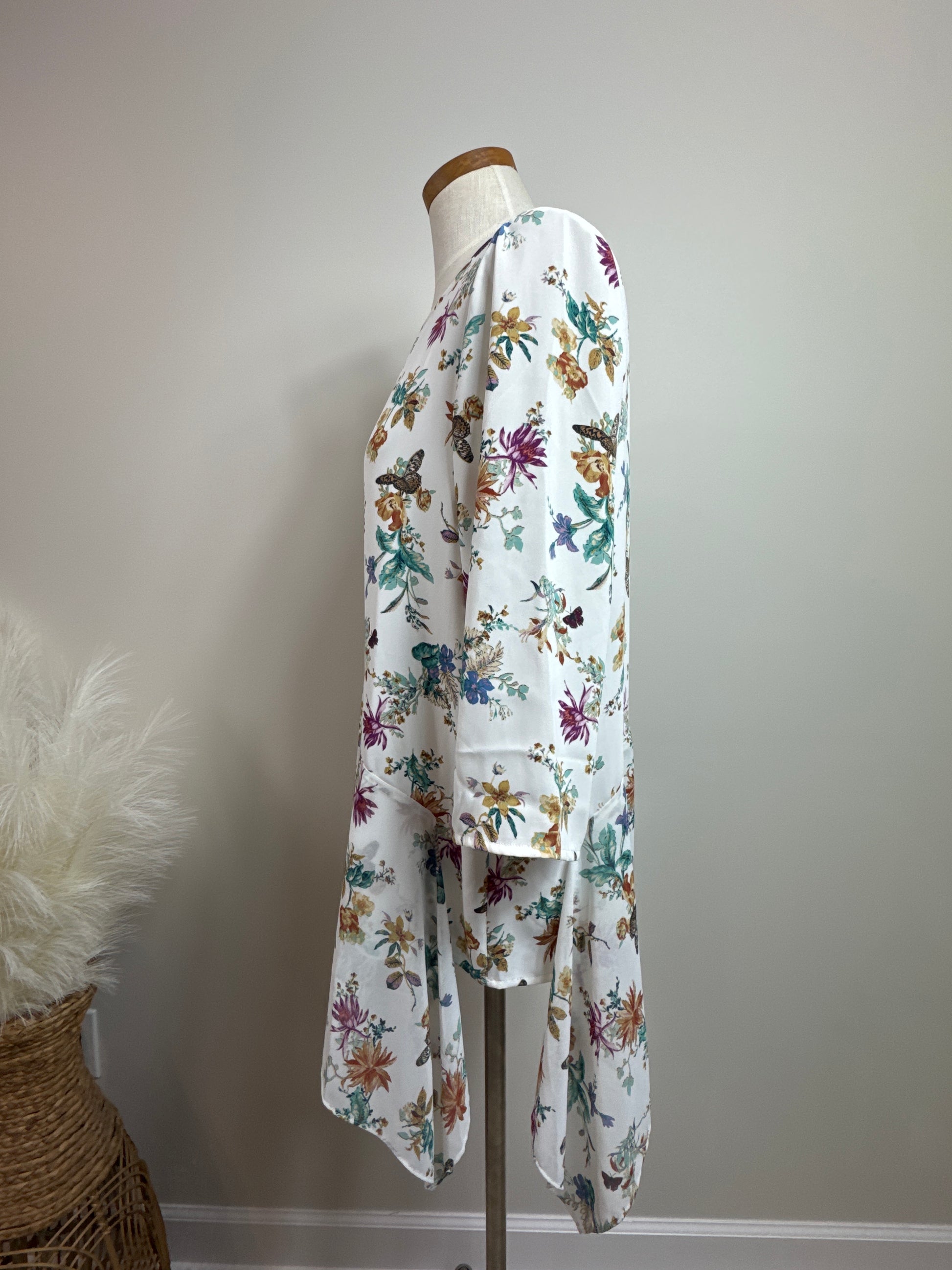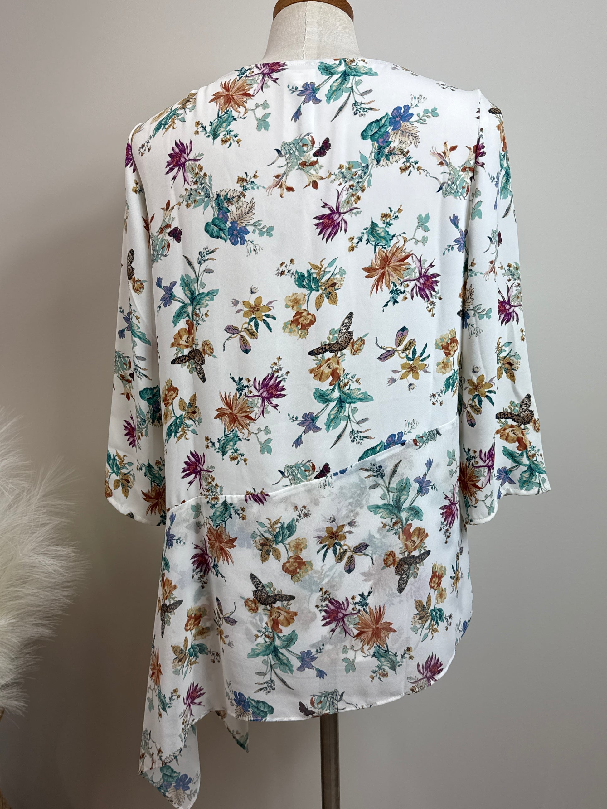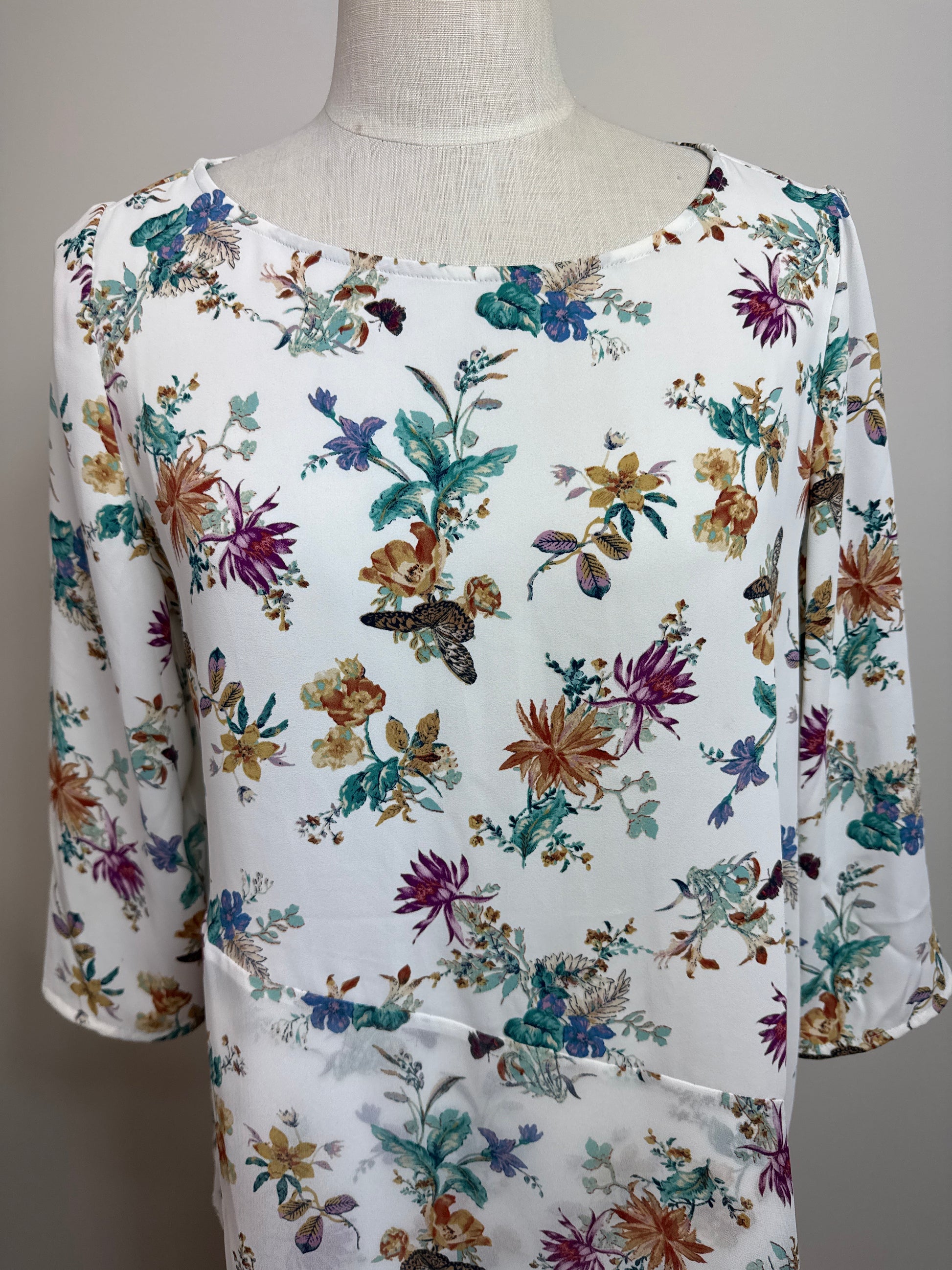 Size 0 Asymmetrical white blouse with flowers. Pull over, 3/4 Length sleeves.