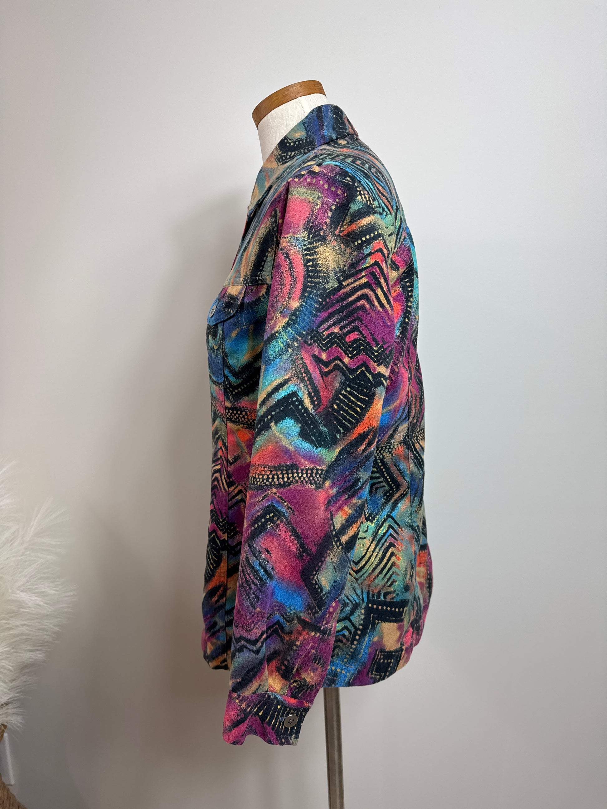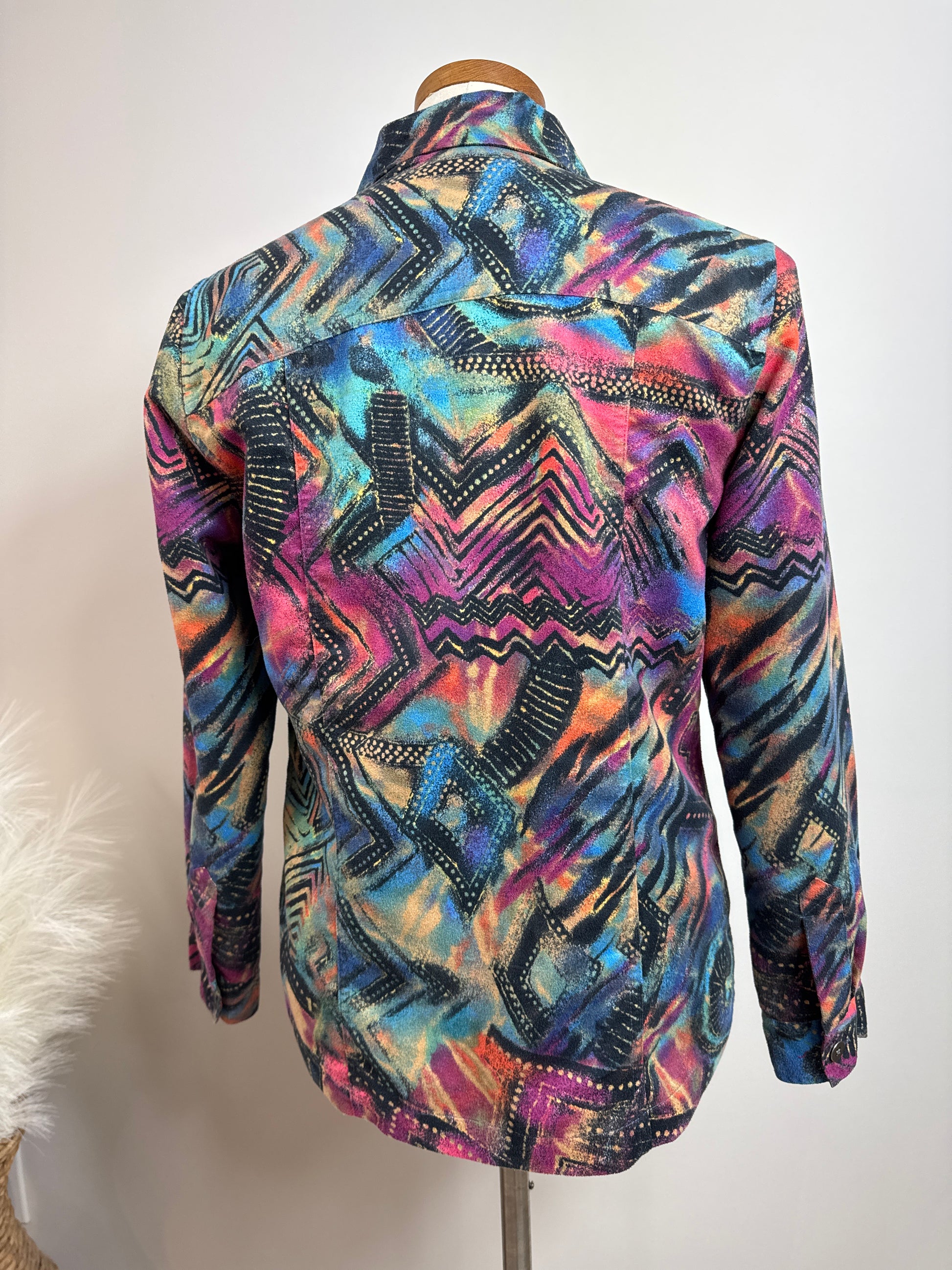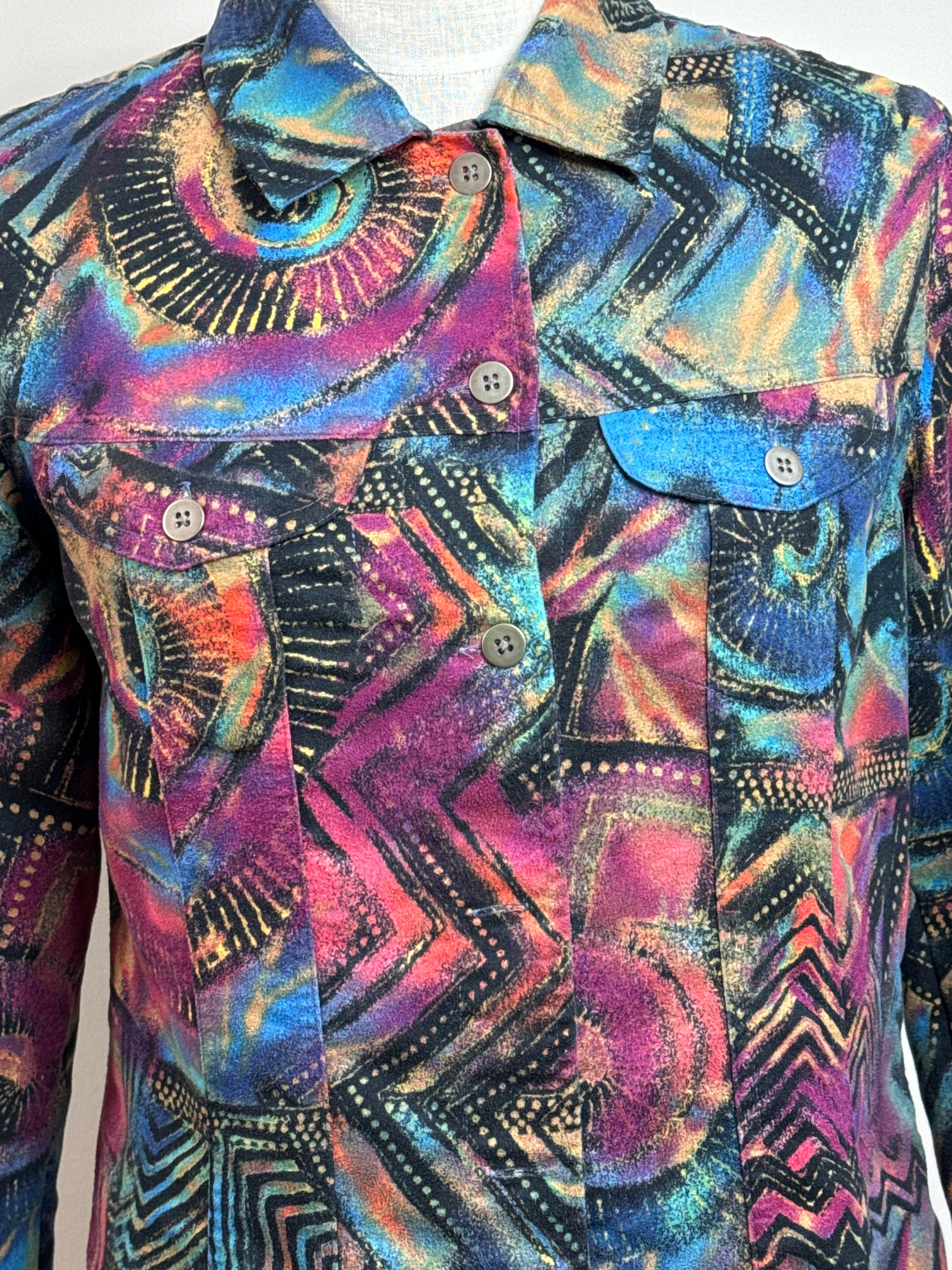 Size 0 Multi Color primary purple button up jacket. P2P 20”, Length 25”. 2 pockets on breast, 100% Polyester. Long sleeves. Very soft fun lightweight jacket.