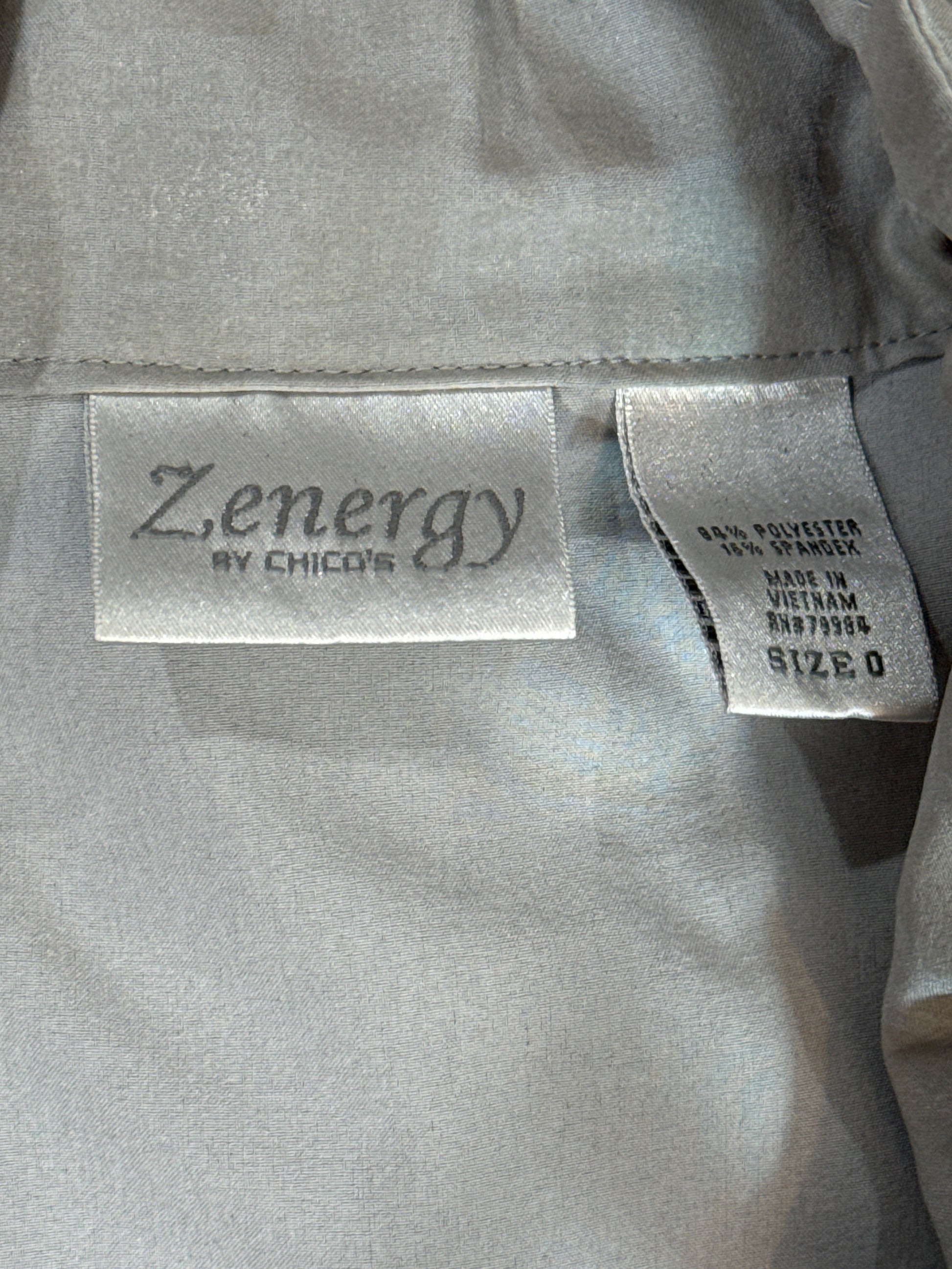 Size 0 Gray Zenergy Zip up lightweight jacket. P2P 19”, Length 23”, 3/4 Sleeves. 84% Polyester, 16% Spandex. Drawstrings at arms, zipper pockets on front, drawstring at neck. 4 open pockets on front.