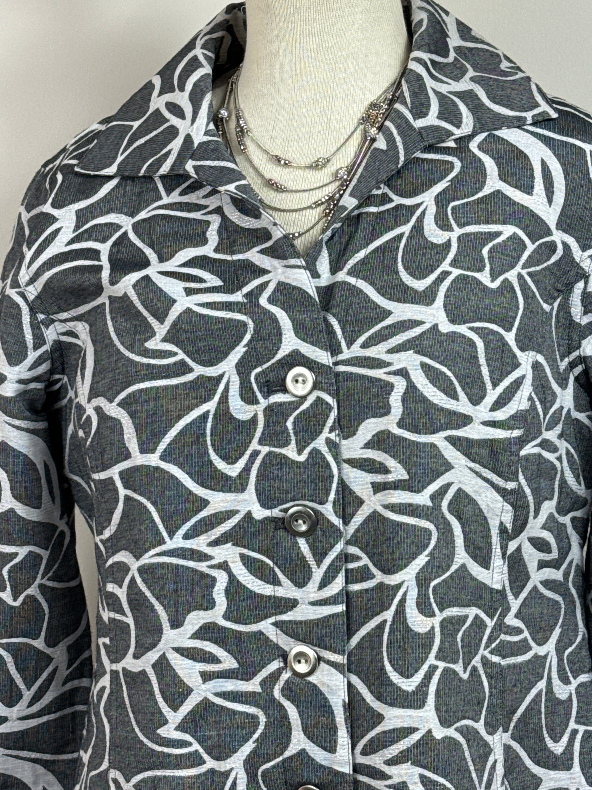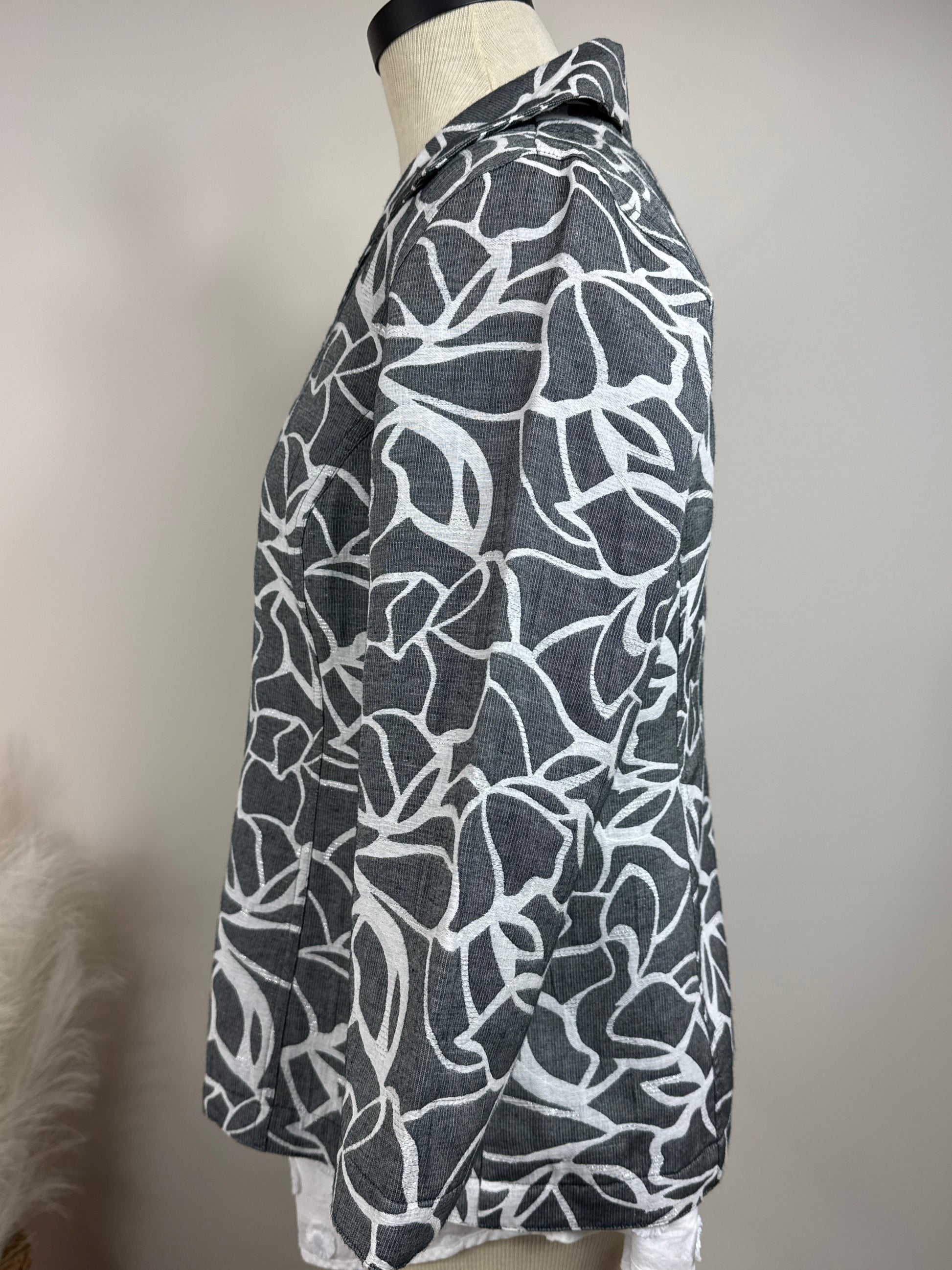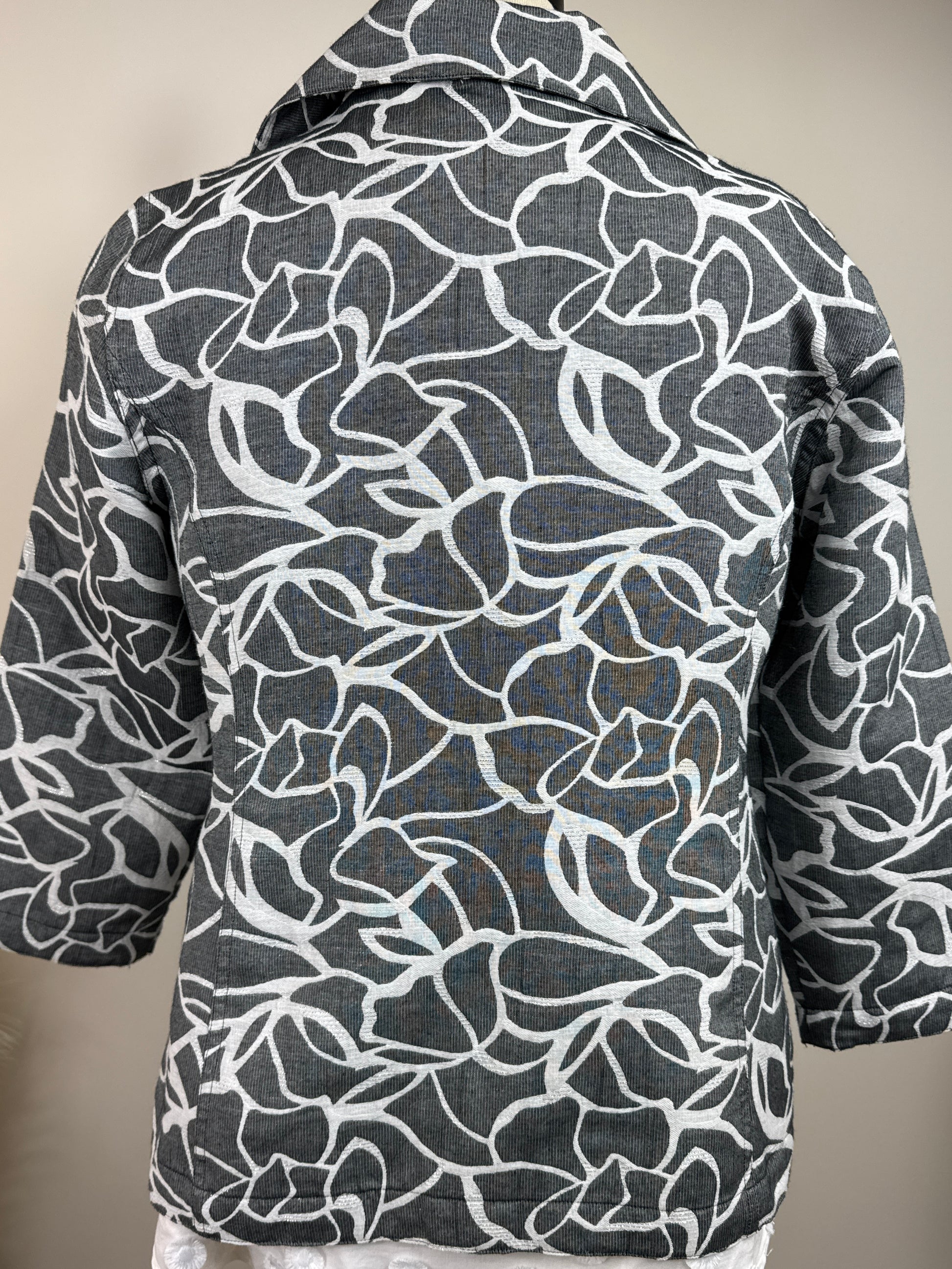 Size 1 Button up Light Weight Jacket in Gray with silver threading. 3/4 sleeves, P2P 20", length 23", 5 silver buttons down front, no pockets. 64% cotton, 34% polyester, 2% other.