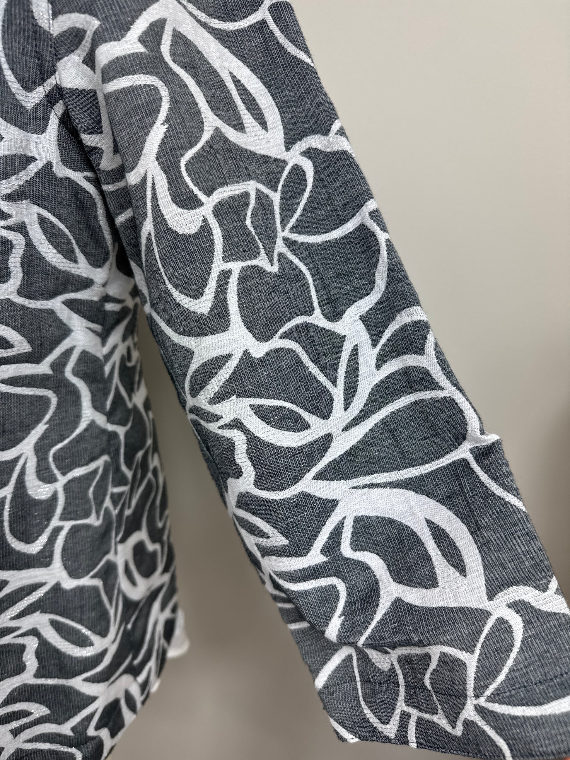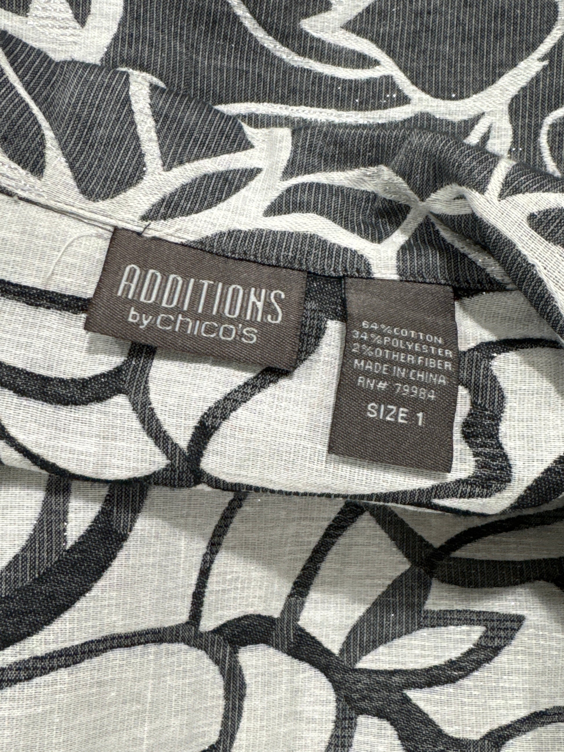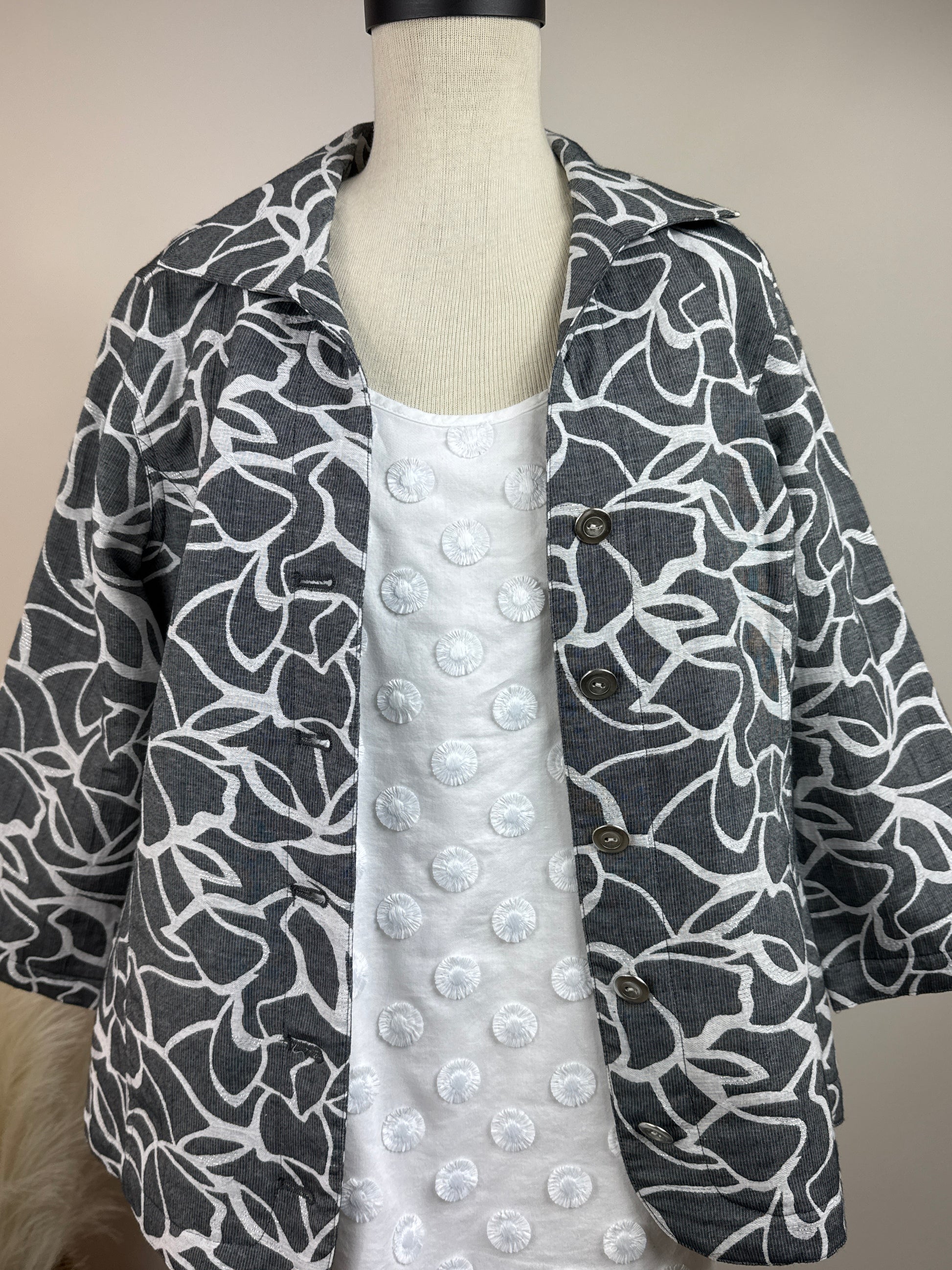 Size 1 Button up Light Weight Jacket in Gray with silver threading. 3/4 sleeves, P2P 20", length 23", 5 silver buttons down front, no pockets. 64% cotton, 34% polyester, 2% other.