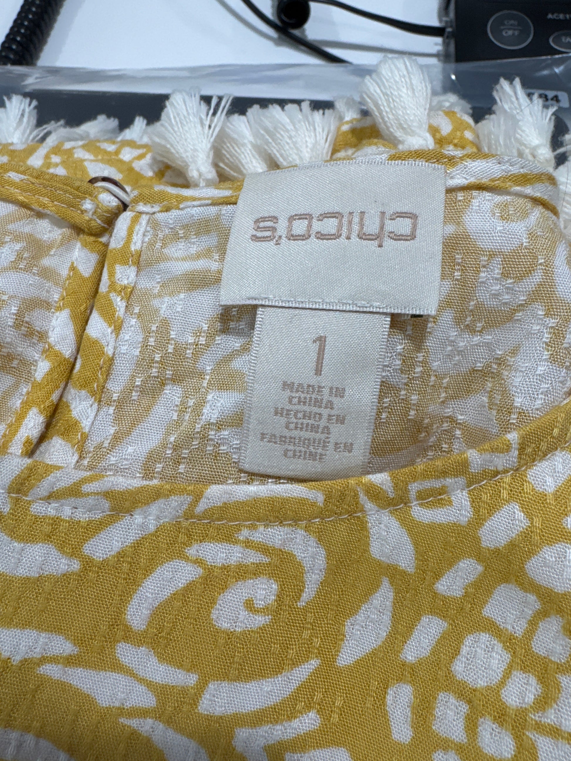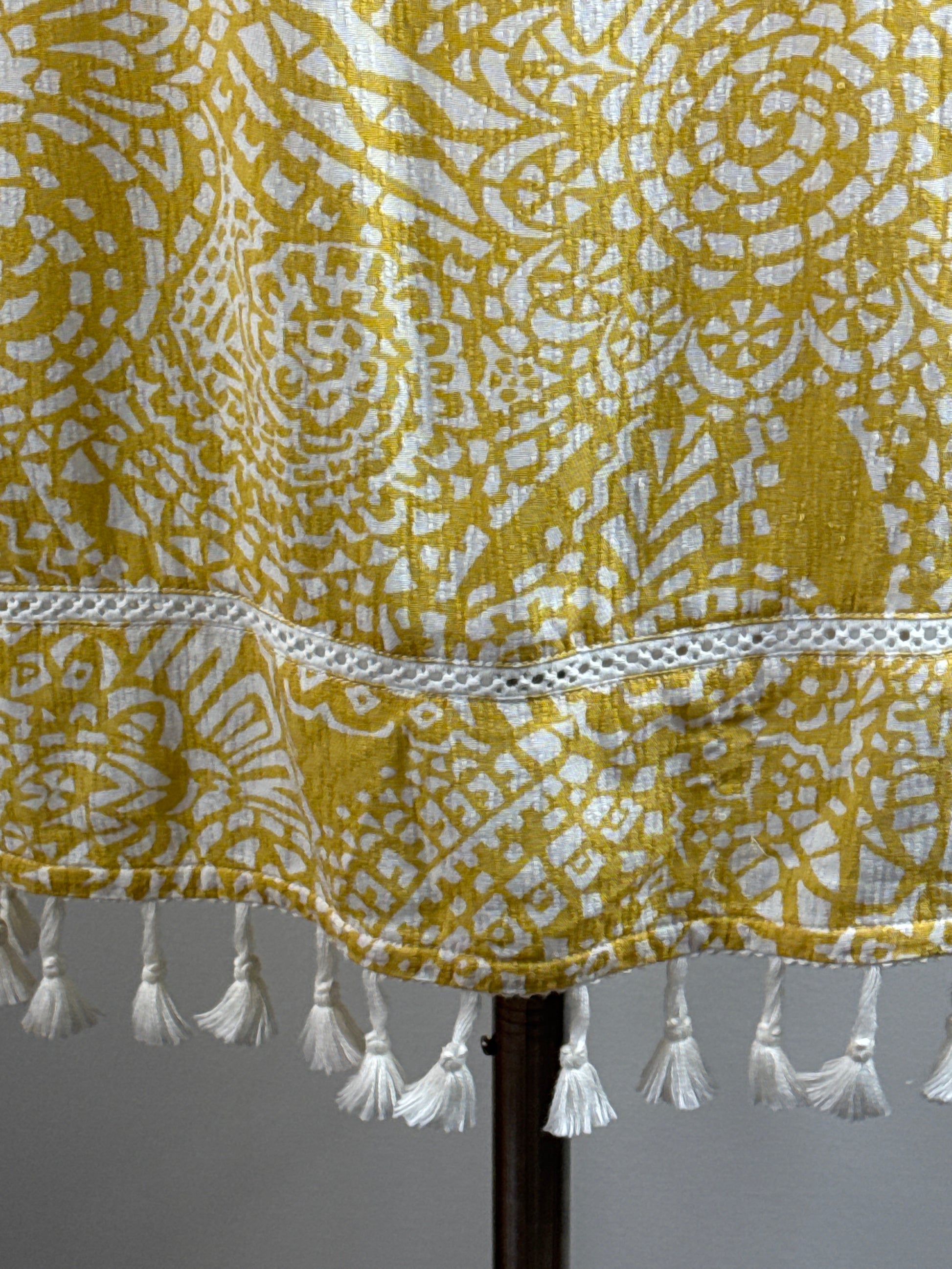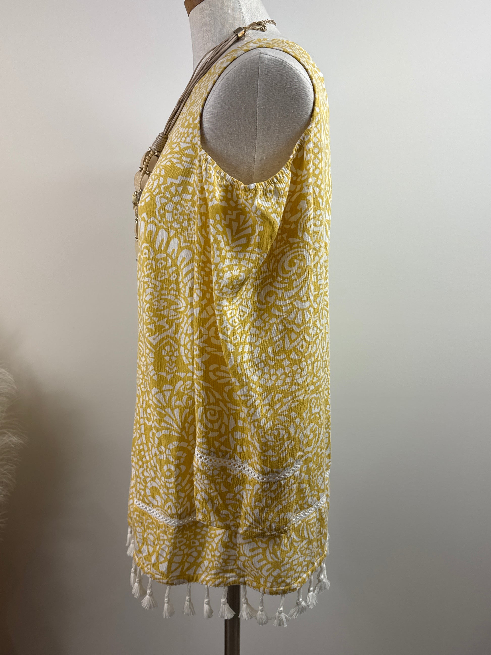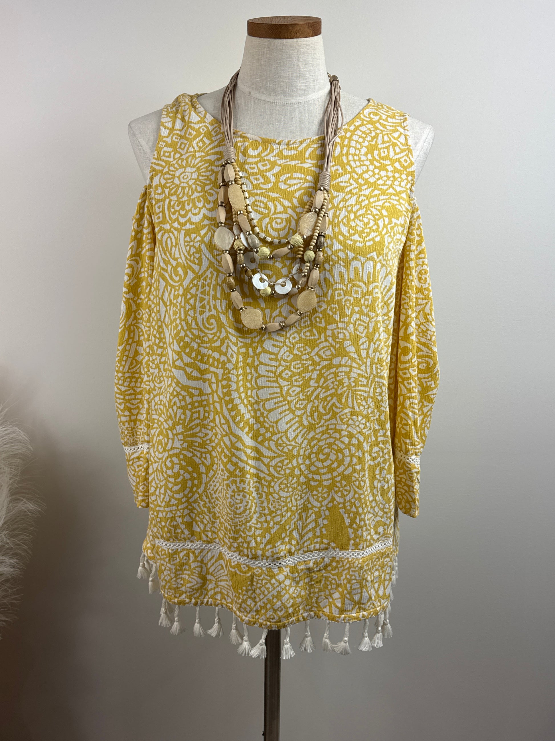 Size 1 Pullover Peek-a-boo Shoulders Top with fringe in pale mustard yellow and white. P2P 21" and overall length to fringe bottom 28". Pearl button closure in back at neck. 100% Rayon and fringe 100% cotton