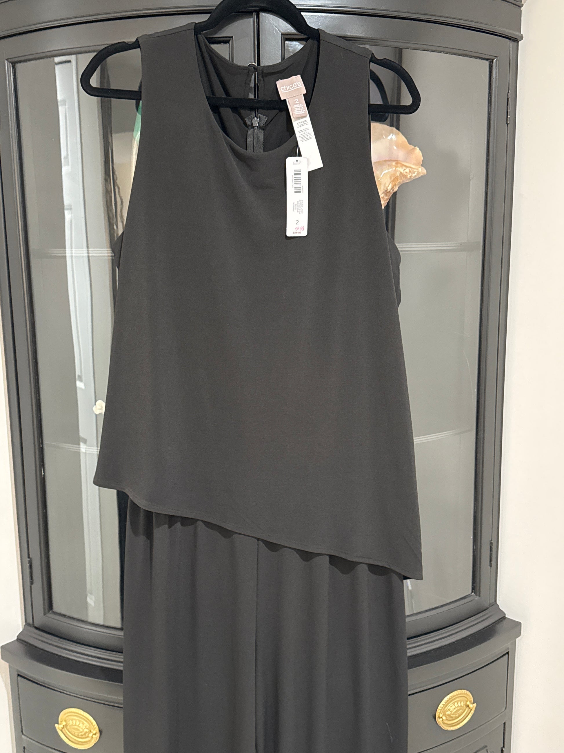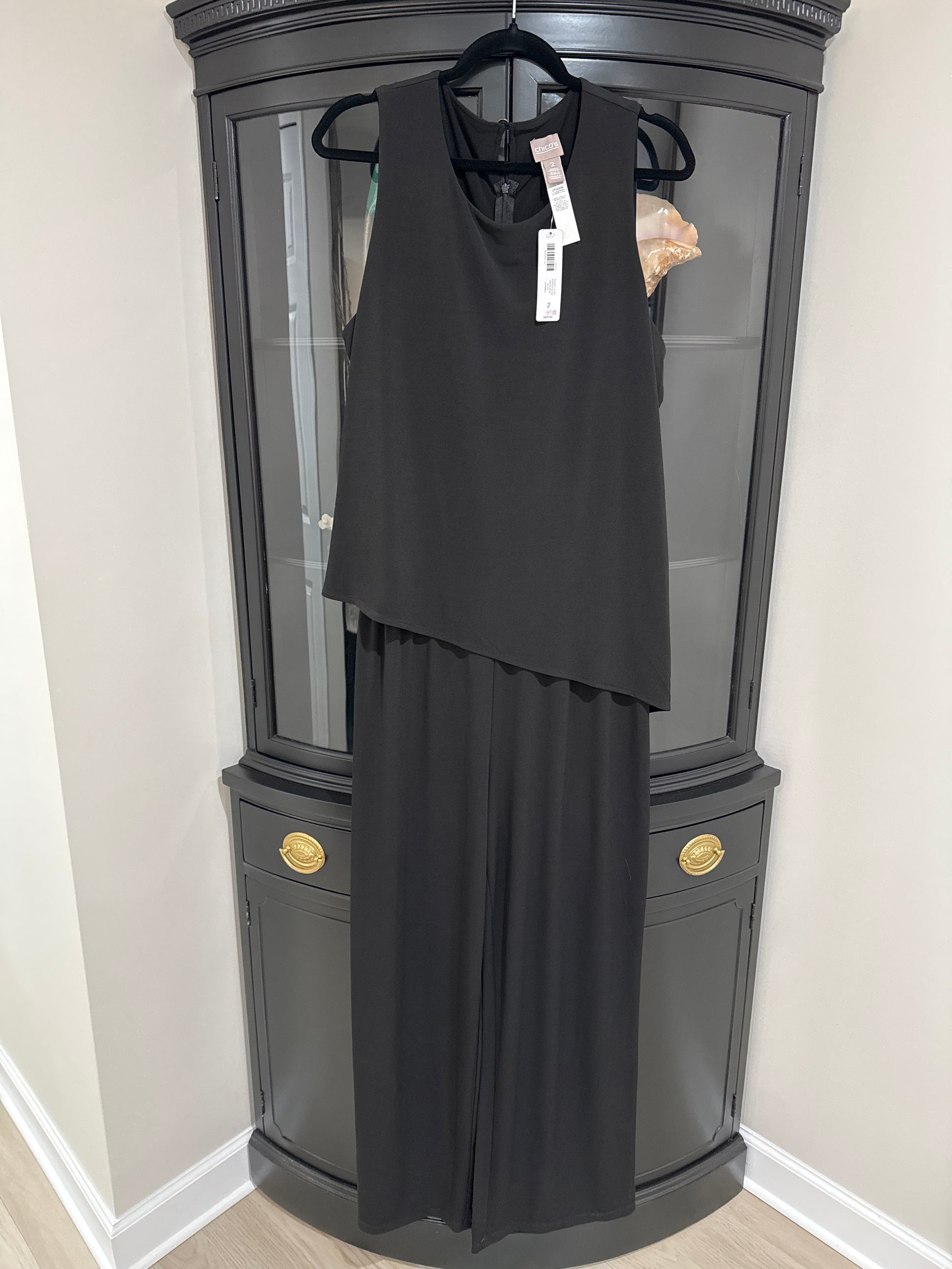 Size 2 NWT originally $89 Double Layer Jumpsuit in black. Asymmetrical layer on top, zipper back closure with gold button at neck. P2P 22”, overall length 61” approx.