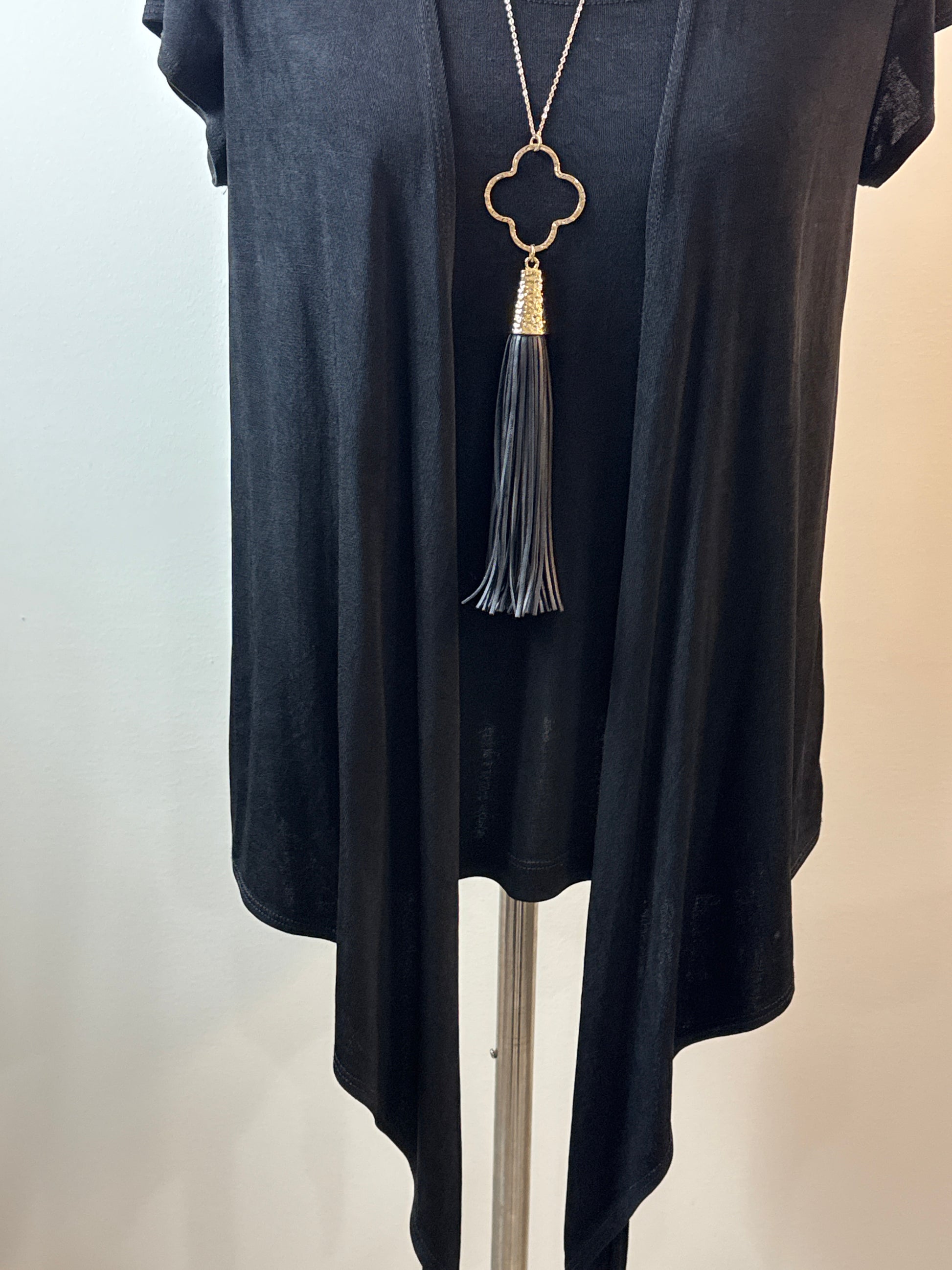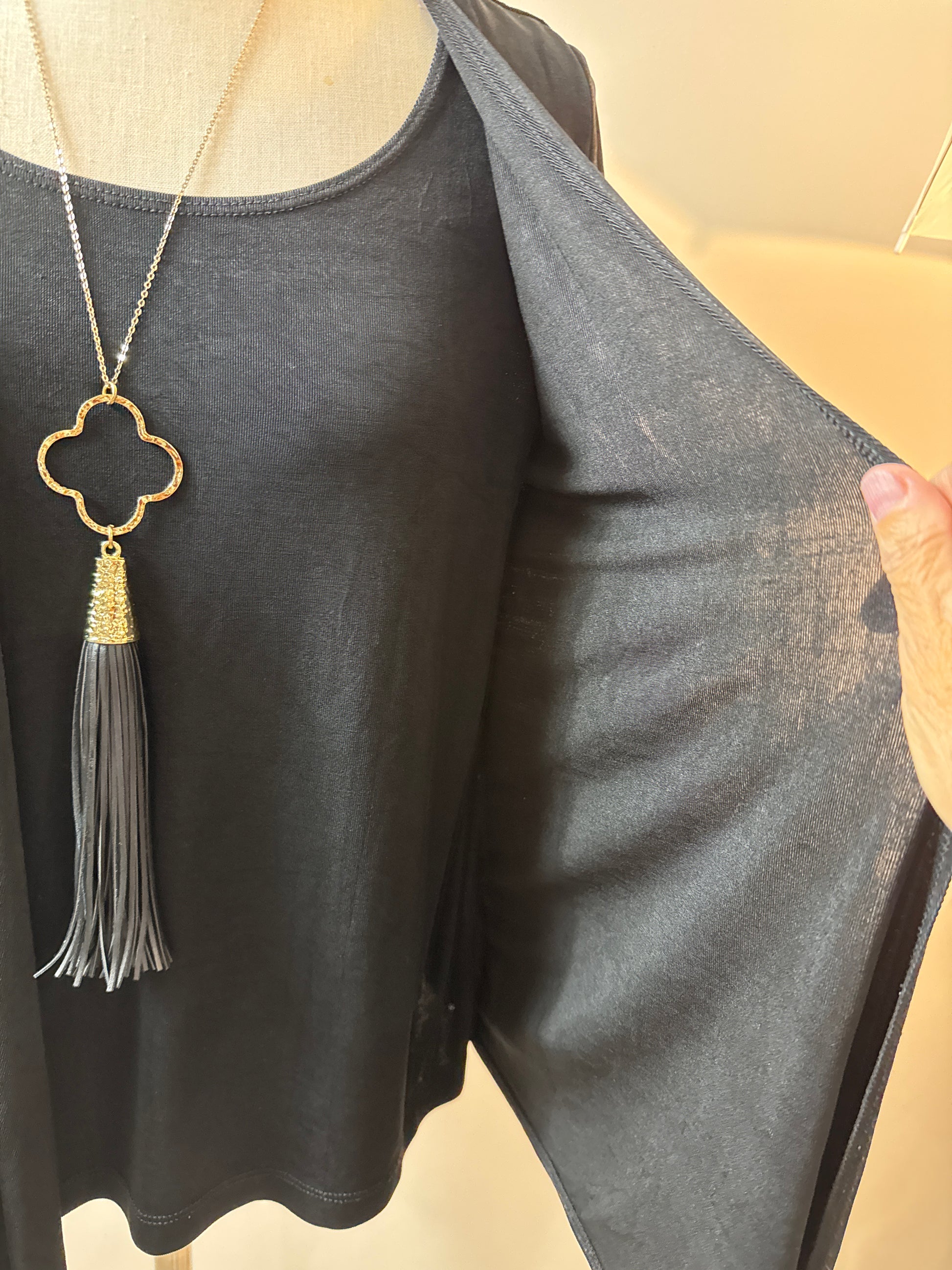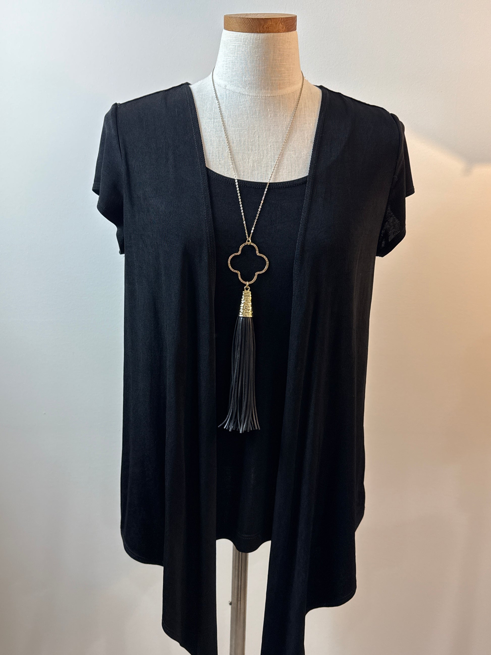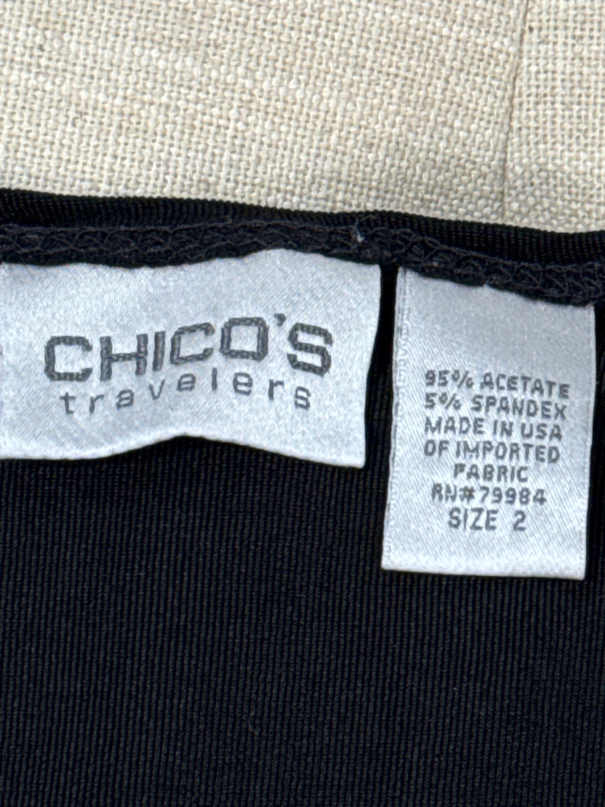 Size 2 Travelers 2 in 1 top dress up or down. Short sleeve top with attached cardigan front panels that are asymmetrical in the front.?Perfect for traveling. P2P 22”, overall length 25” with 11” drops in the front. Necklace not included.