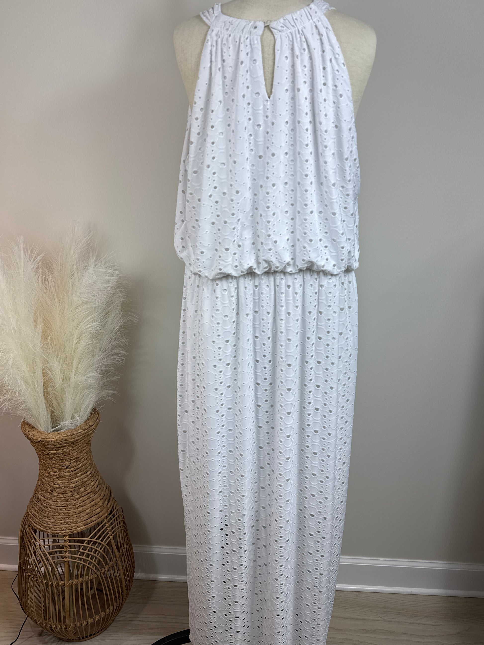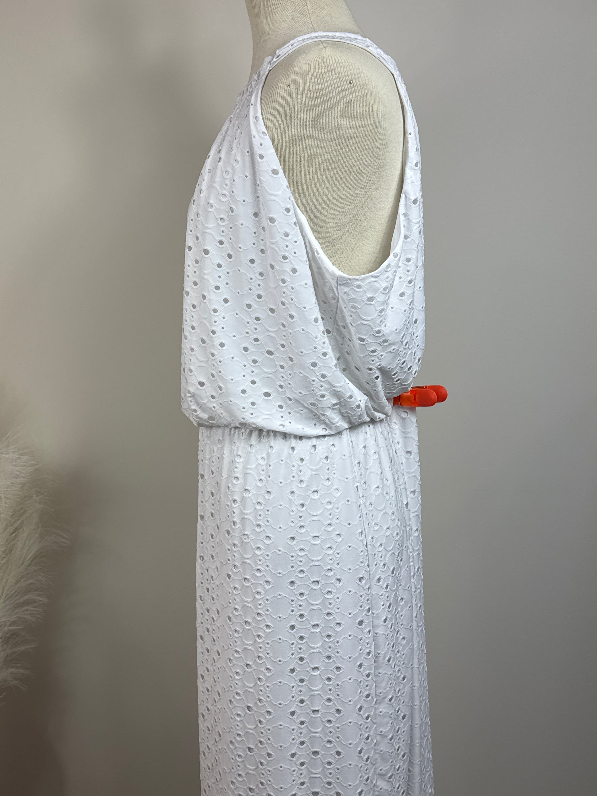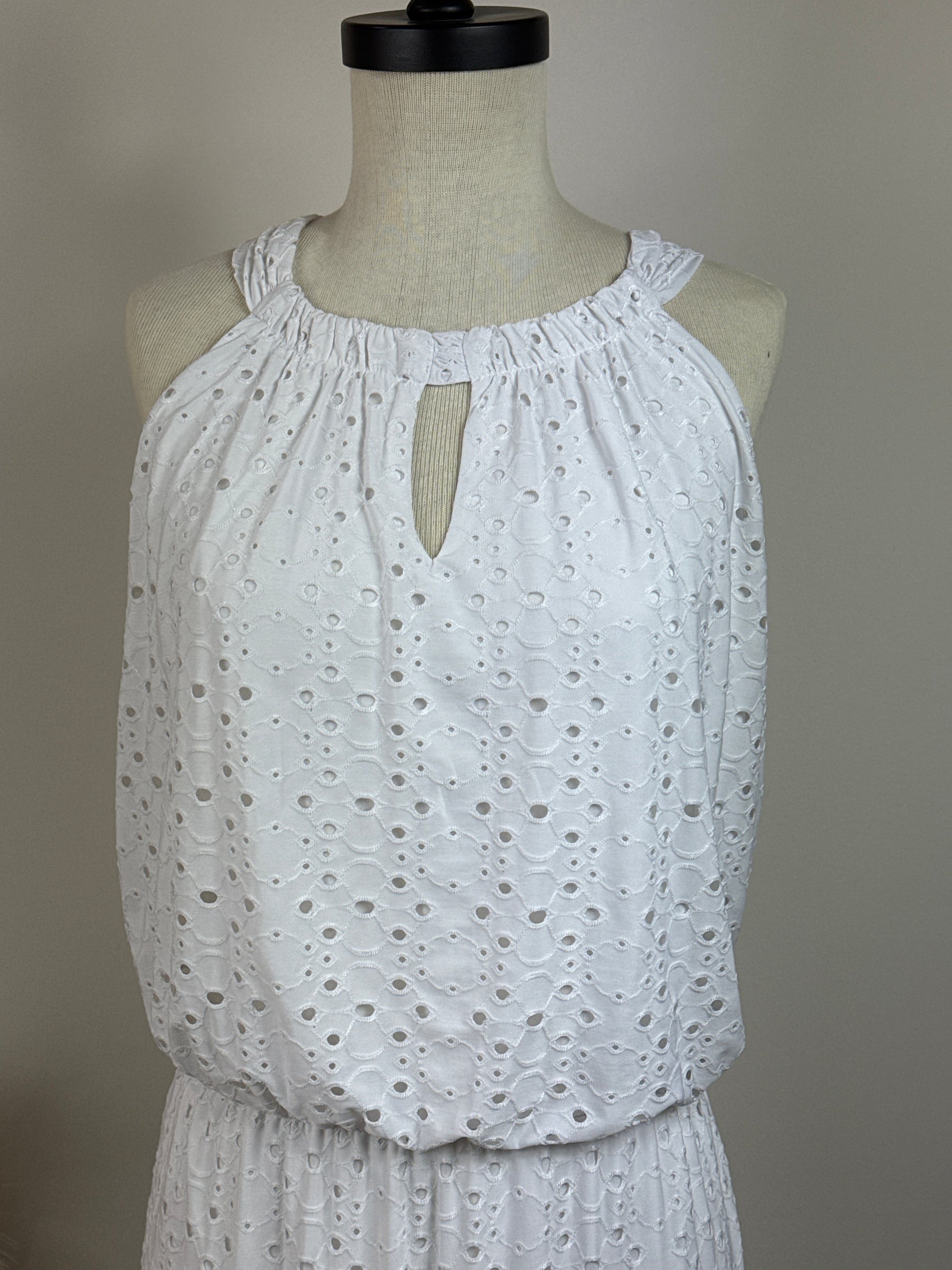 Size 3 Sleeveless White Dress Empire Waist. Cutout overlay. Shell 87% polyester and 13% spandex, lining 100% polyester. P2P 25", Length 54". Front has keyhole opening at neck. Lining goes to side slits.