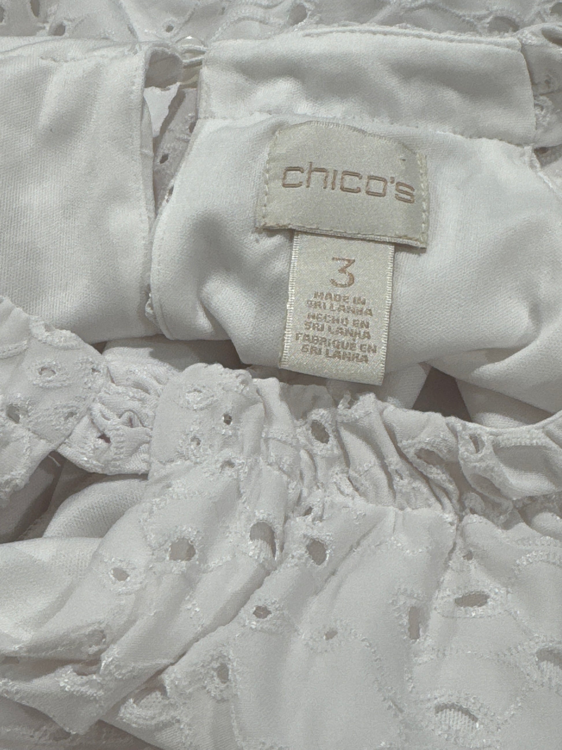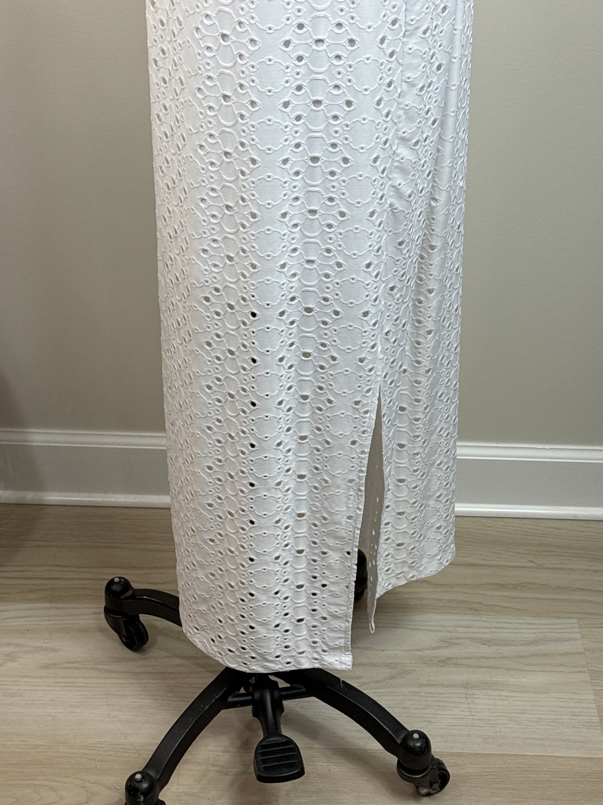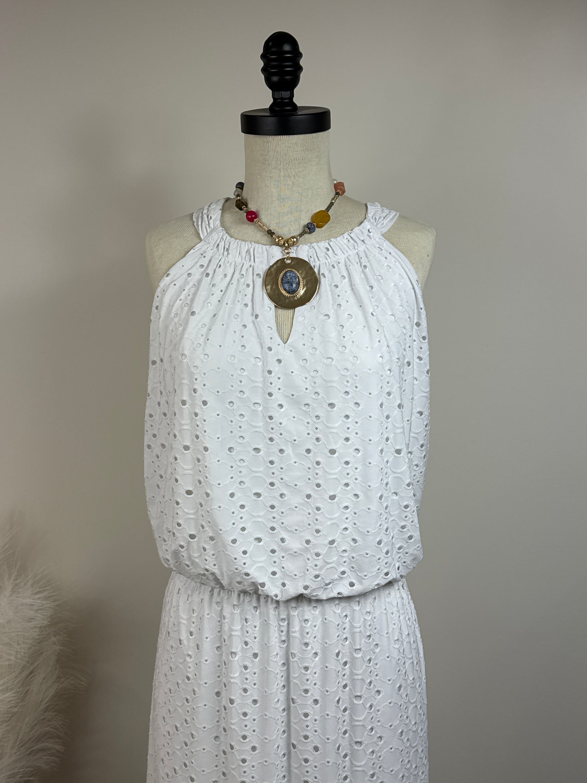Size 3 Sleeveless White Dress Empire Waist. Cutout overlay. Shell 87% polyester and 13% spandex, lining 100% polyester. P2P 25", Length 54". Front has keyhole opening at neck. Lining goes to side slits.