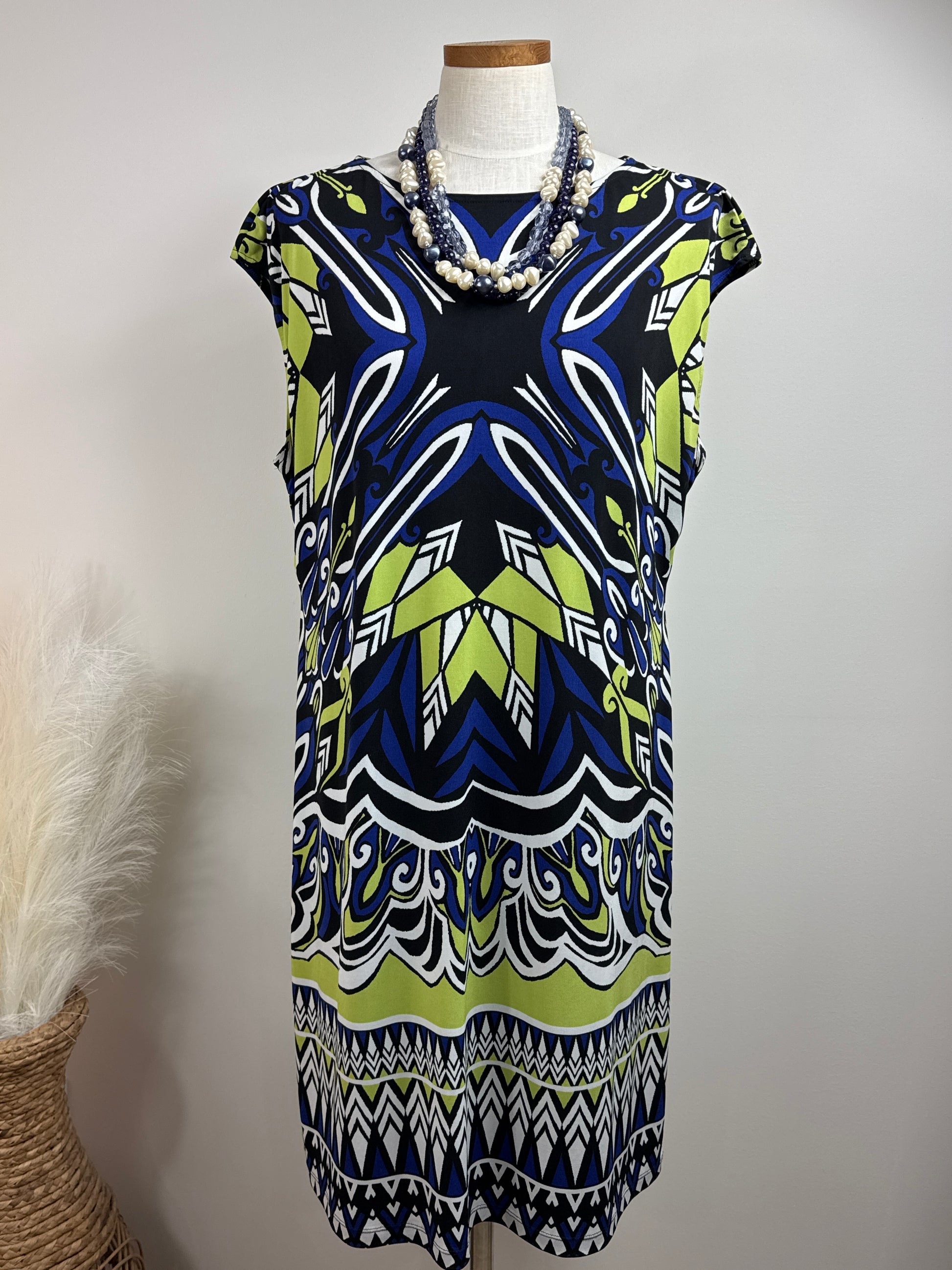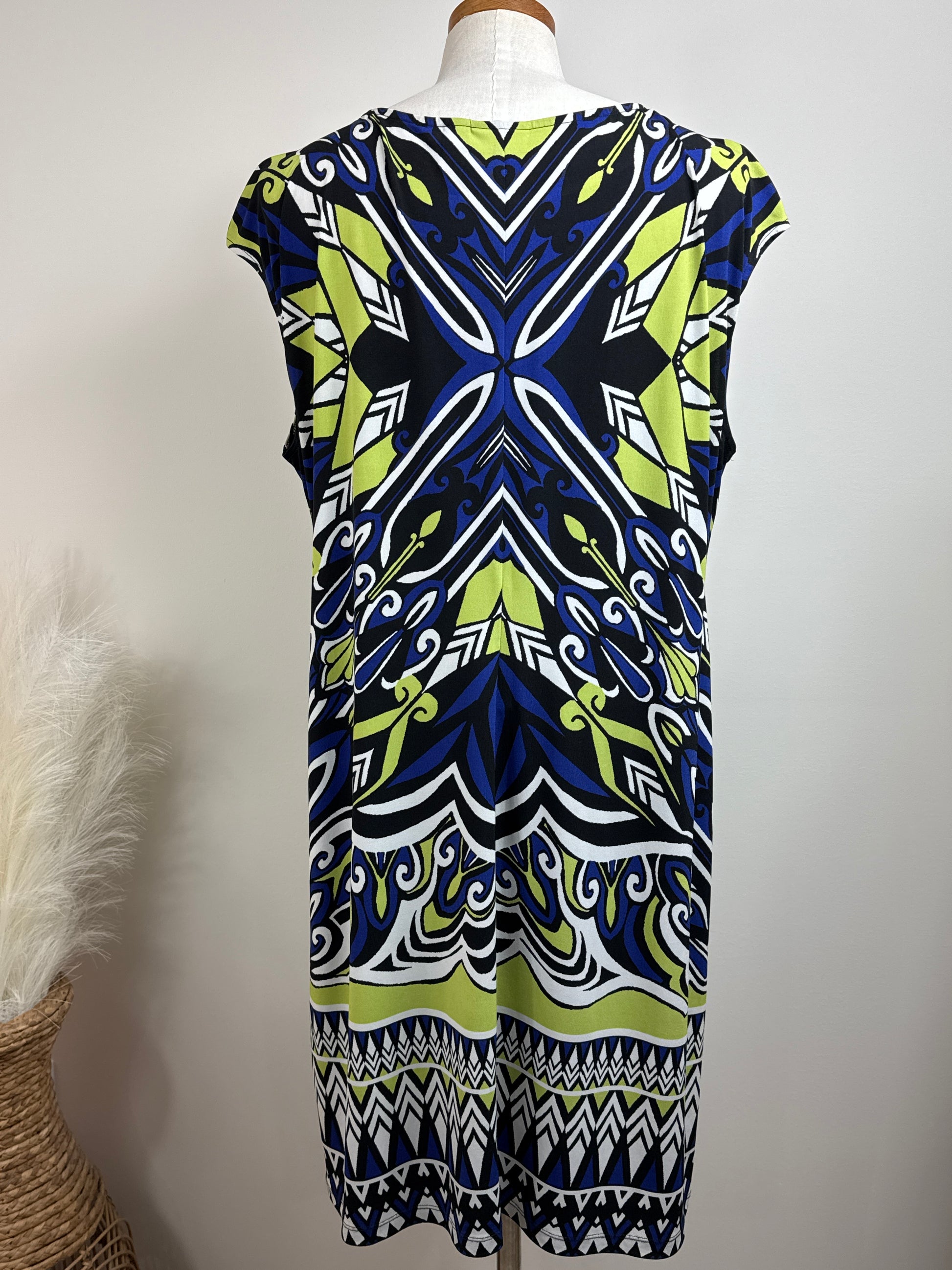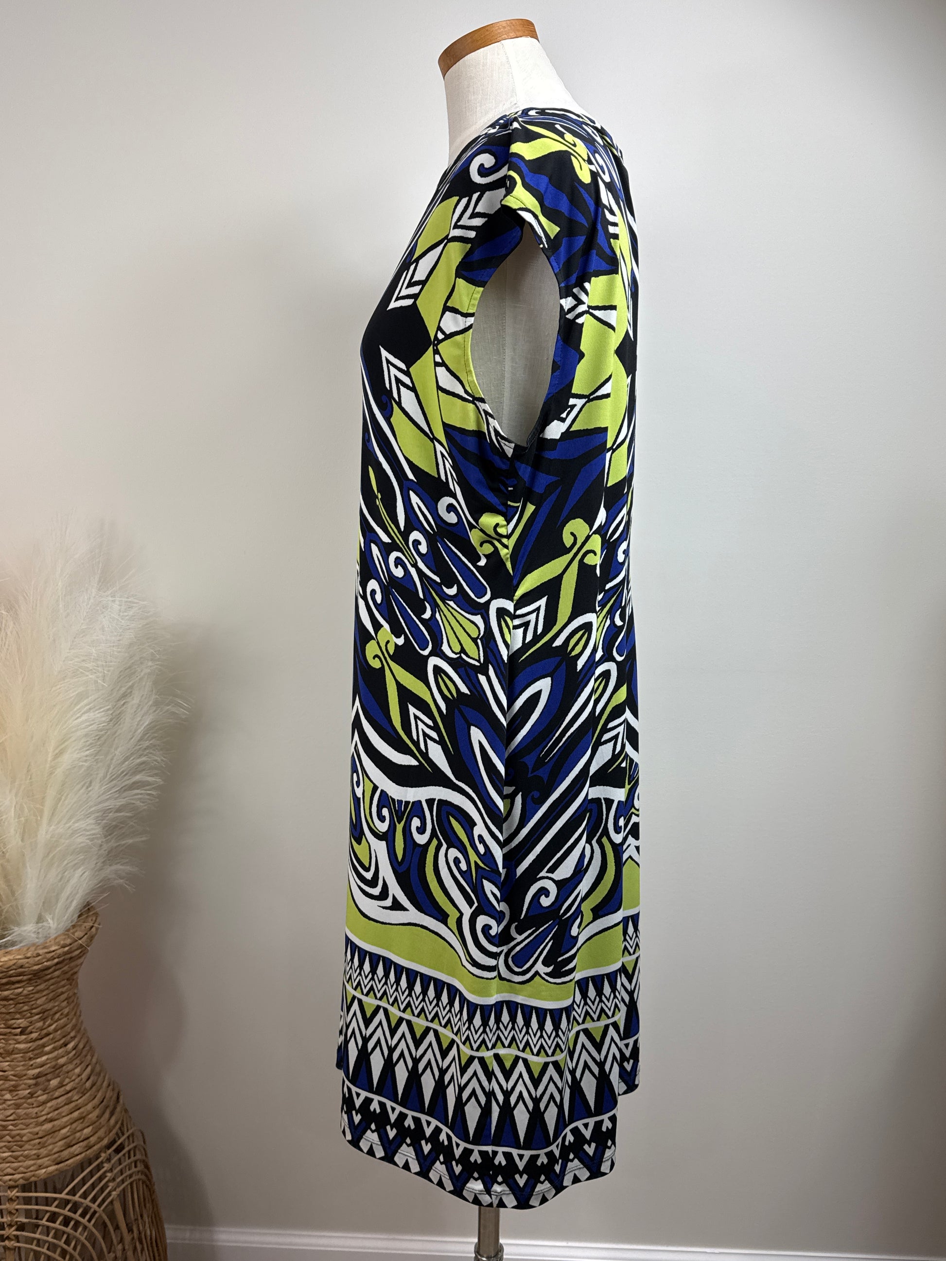 Size 3 Travelers Print Dress, cap sleeves, 95% polyester, 5% spandex. P2P 25", length 28". Colors are royal blue, bright green, and white.
