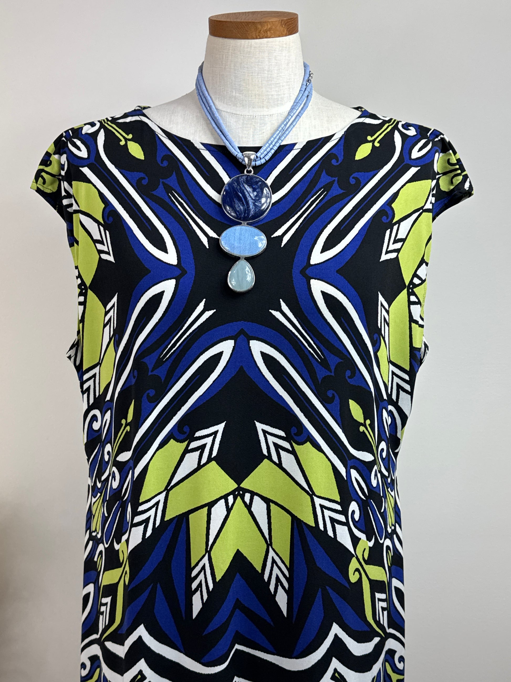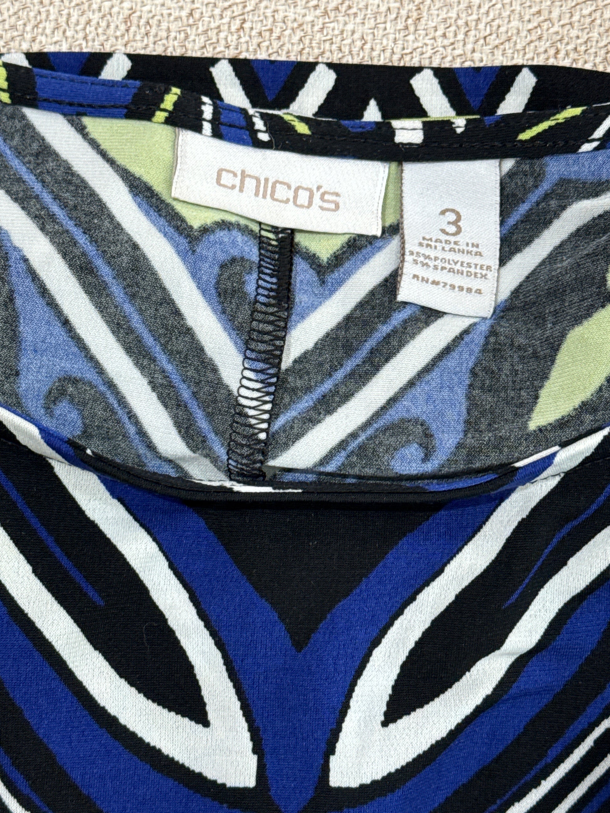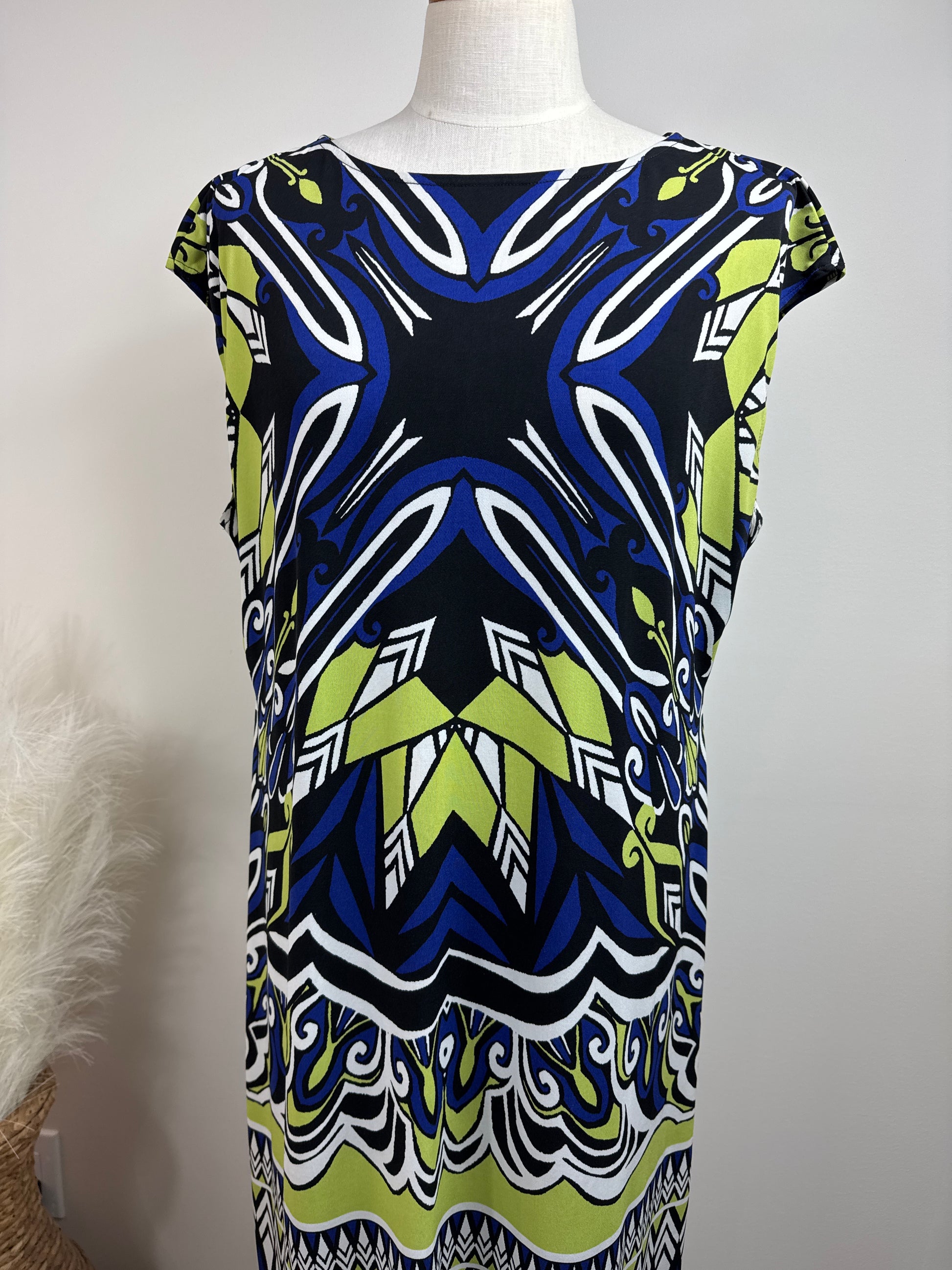 Size 3 Travelers Print Dress, cap sleeves, 95% polyester, 5% spandex. P2P 25", length 28". Colors are royal blue, bright green, and white.