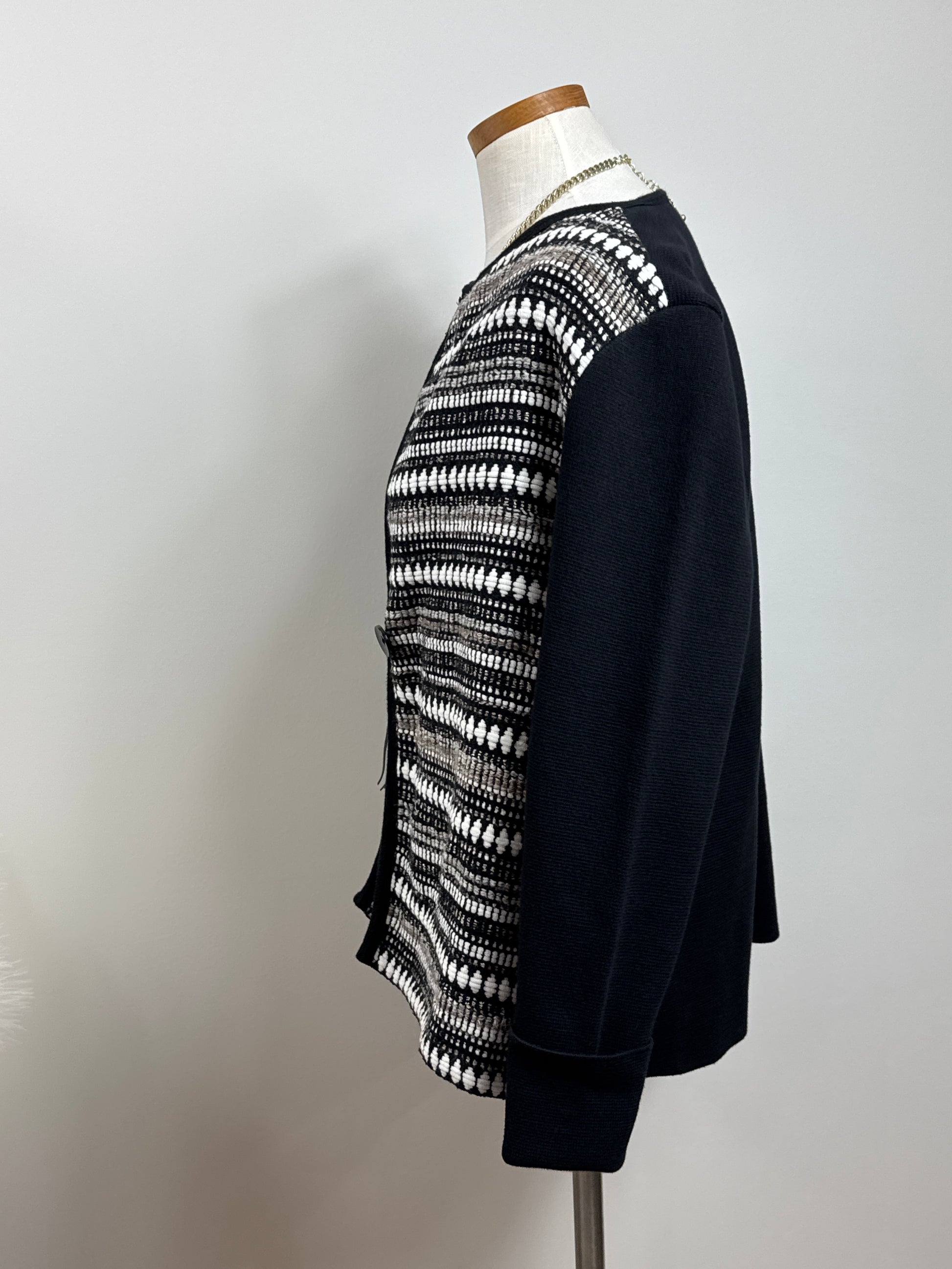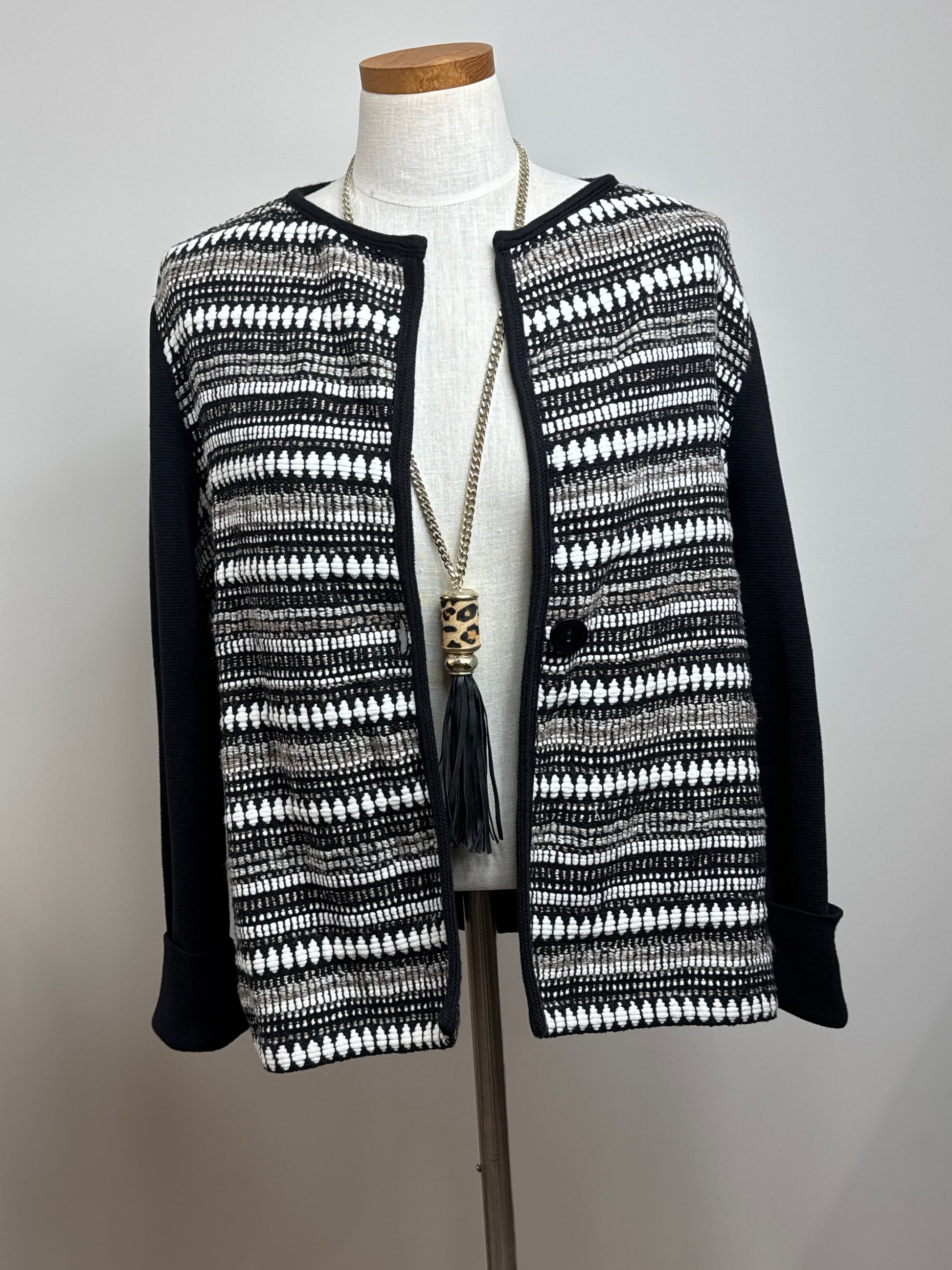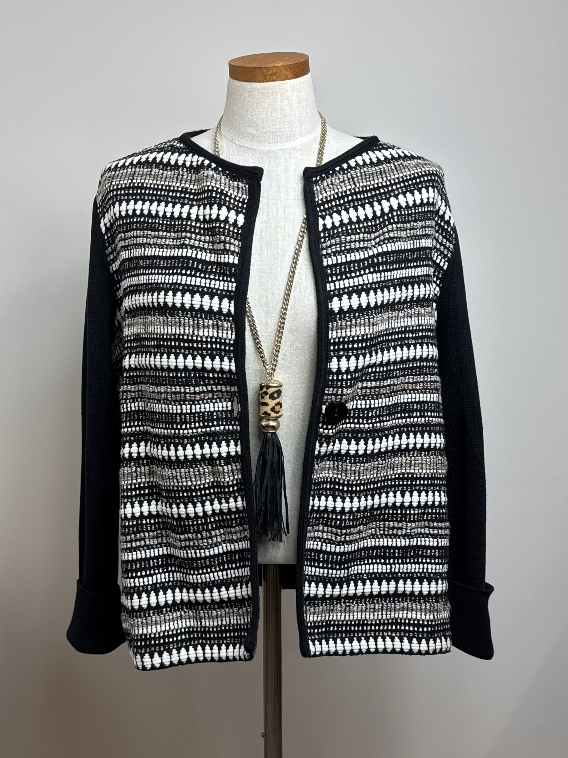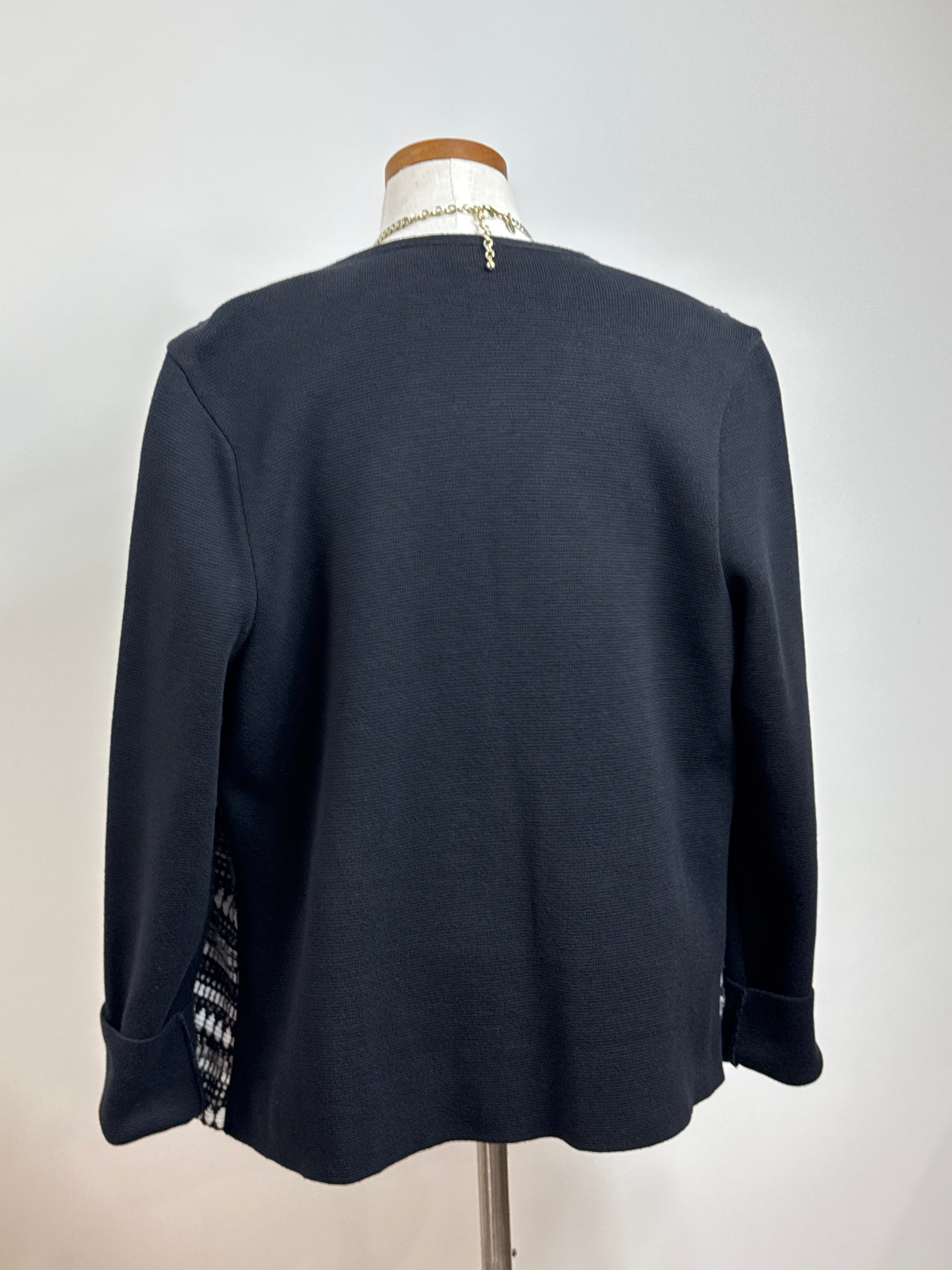 Size 2 Black multi color cardigan can be worn open or button. 64% Cotton, 23% Acrylic,4% other fibers. Gold fibers in front. P2P 24”, overall length 35”